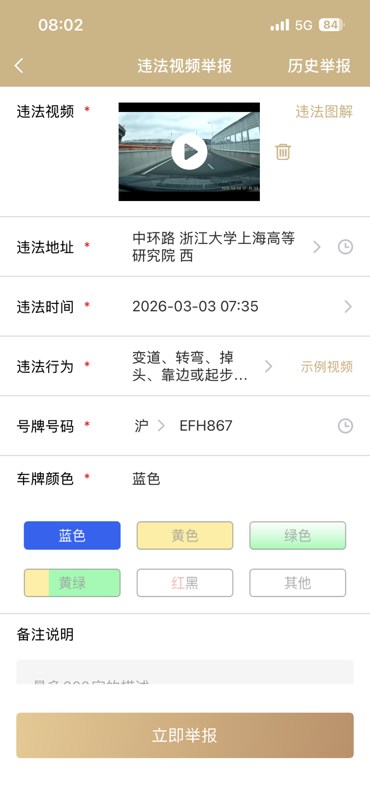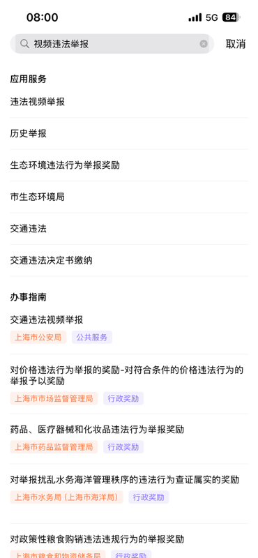 上海市举报机动车交通违法行为 在上海辖区是可以自己举报机动车交通违法行为的。 1,下载打开“随申办市民云”app 2,搜索“视频违法举报” 3,选择本地视频。注意需要自己将视频内容编辑到20秒之内,并且车牌及违法内容清晰可见。 4,提交完成 相关
